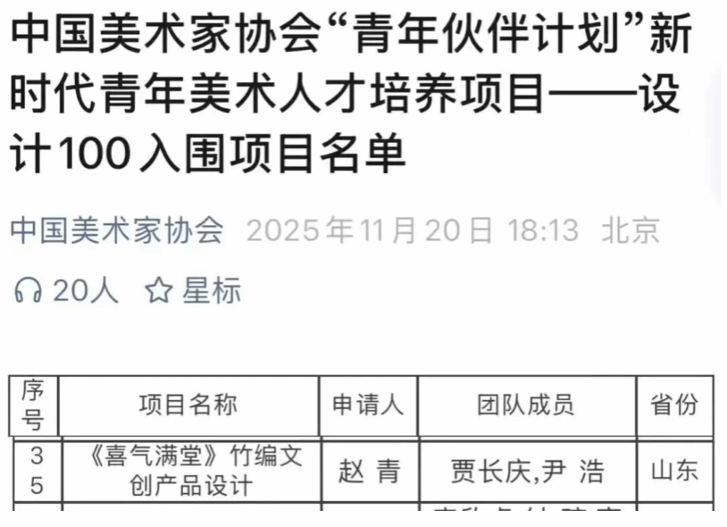 11月20日,中国美术家协会公布《中国美术家协会“青年伙伴计划”新时代青年美术人才培养项目——设计100入围项目名单》,我校设计学院教师赵青的作品《“喜气满堂”竹编文创产品设计》入选,是山东省唯一的入选作品。