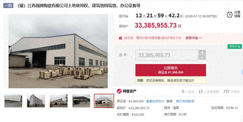 同样是2026年1月12日9时至2026年1月12日17时止,江西瑞牌陶瓷有限公司还有一批产成品及机器设备亦公开拍卖。起拍价为:3,466,621.91元。