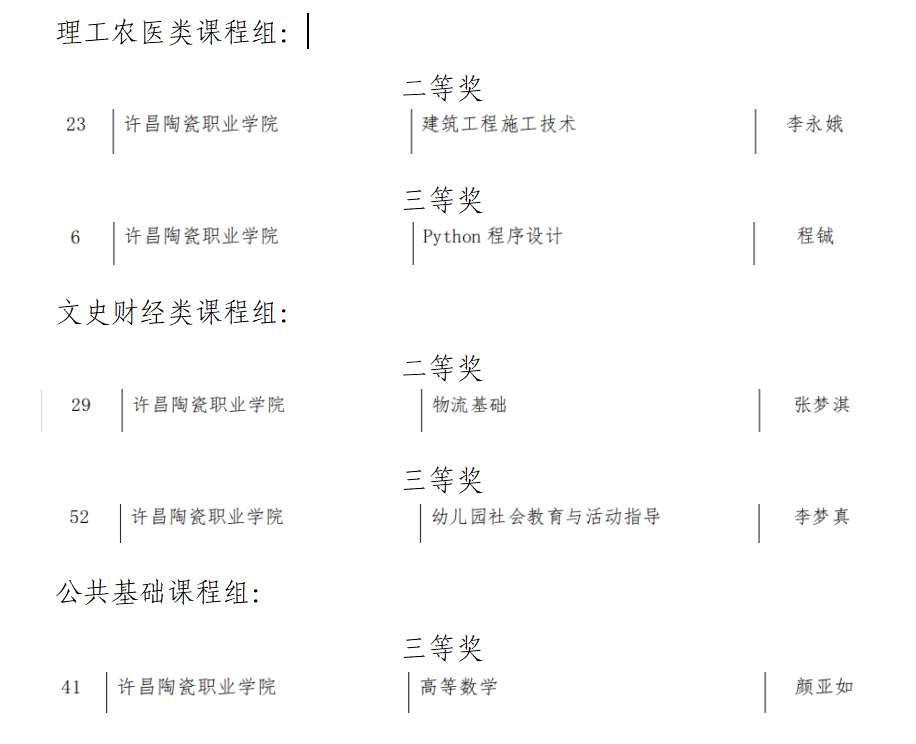 近日,河南省教育厅公示了2025年河南省高等职业教育课堂教学创新大赛获奖名单,许昌陶瓷职业学院参赛教师凭借精湛的教学技艺和创新的教学设计,在多个课程类别中脱颖而出,最终斩获二等奖2项、三等奖3项。