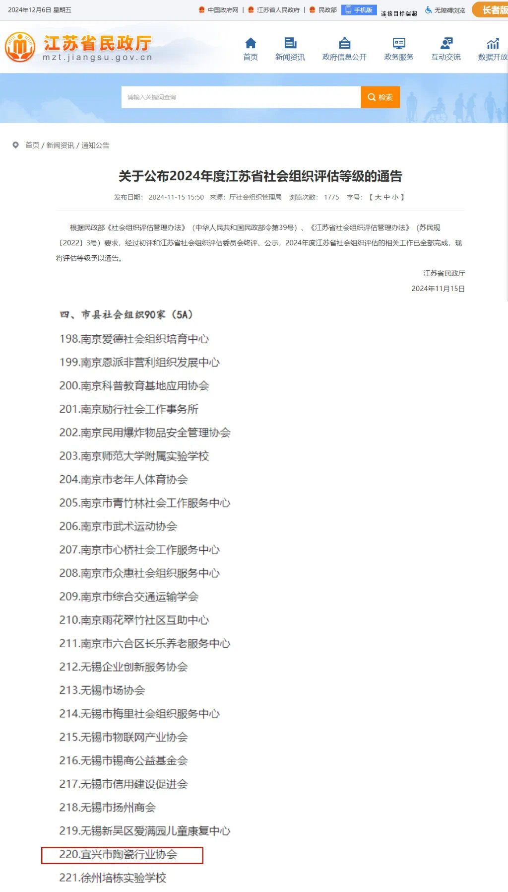 在2024年度江苏省社会组织评估等级公布中,市陶瓷行业协会荣获5A级市县社会组织的称号,成为宜兴市首家获此等级的社会团体。