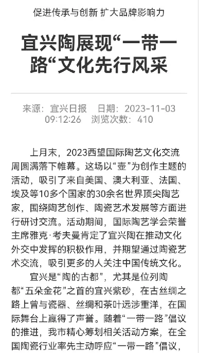 同时,协会还积极参与“一带一路”艺术展,这一平台拓展了国际陶瓷交流,进一步加强了宜兴与世界各国在陶瓷艺术领域的交流与合作,提升了宜兴陶瓷在国际上的影响力。
