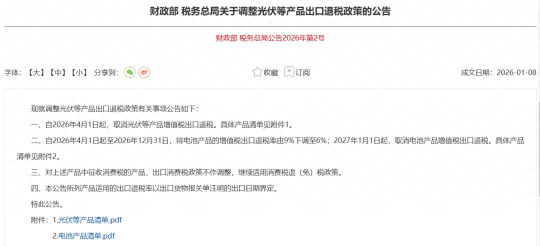 1月8日,财政部、国家税务总局发布《关于调整光伏等产品出口退税政策的公告》,决定自2026年4月1日起,取消光伏等产品增值税出口退税 。电池产品的增值税出口退税率则分阶段调整,自2026年4月1日起至2026年12月31日,将电池产品的增值税出口退税率由9%下调至6%;2027年1月1日起,取消电池产品增值税出口退税。