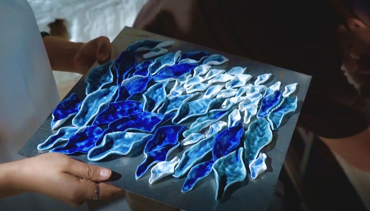 该工艺既保留了每片瓷独特的手工质感与肌理,又通过精密的结构设计,确保了整体形态的连贯与结构的稳固。从而使“青晖”在宏观上呈现浑然一体的完整气韵,在微观处富含细腻生动的陶瓷语言,达成整体与局部的和谐统一。