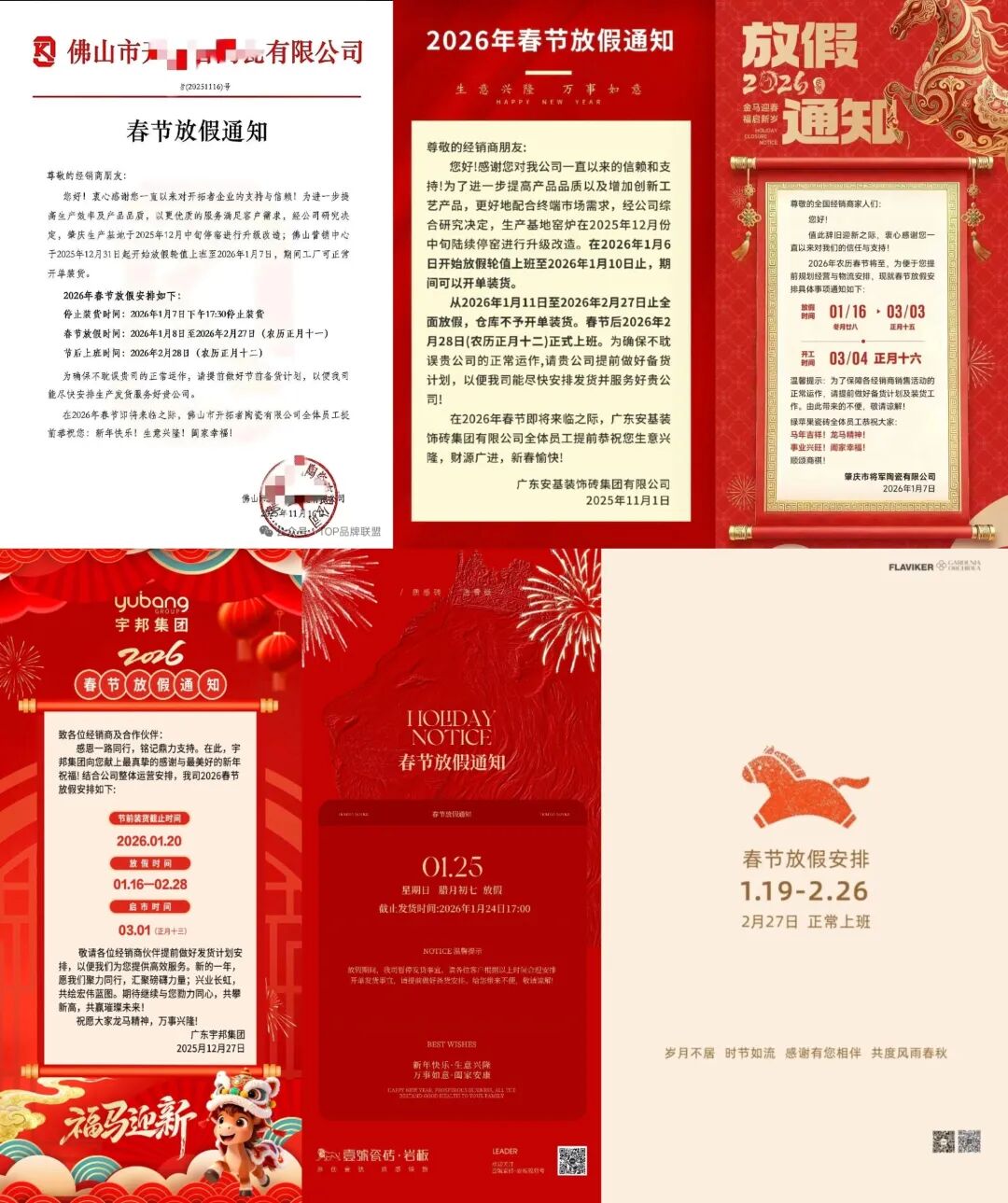 2025年11月1日,安基陶瓷率先发布春节放假通知。通知显示,其生产基地窑炉于2025年12月中旬陆续停窑进行升级改造,2026年1月11日至2月27日为全面放假时间,春节后于2月28日正式上班。