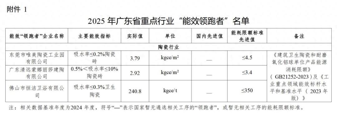 在2025年广东省重点行业“能效领跑者”名单中,陶瓷行业有3家企业上榜,分别是东莞市唯美陶瓷工业园有限公司、广东清远蒙娜丽莎建陶有限公司、佛山市恒洁卫浴有限公司。