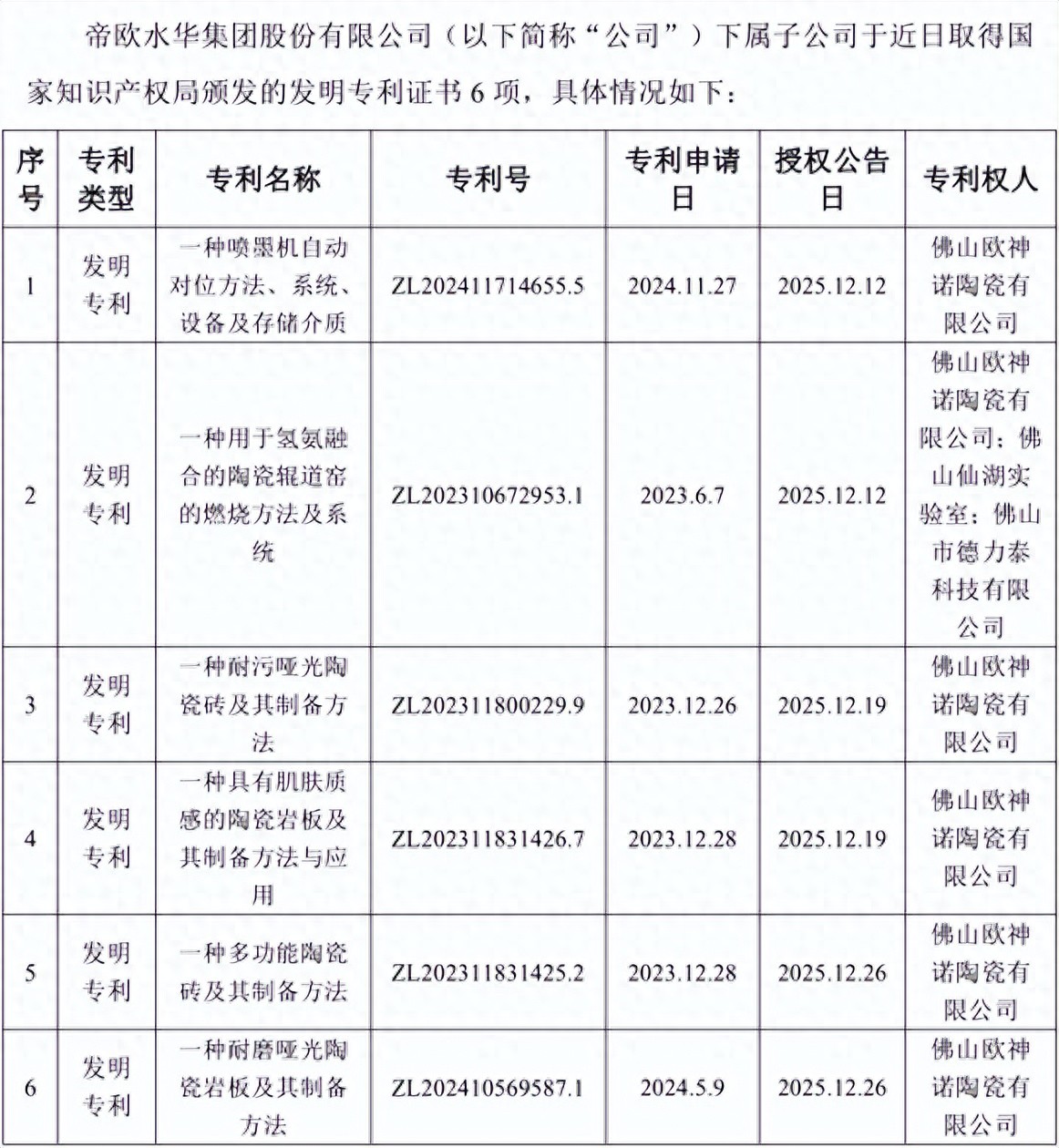 专利名称分别为“一种喷墨机自动对位方法、系统、设备及存储介质”、“一种用于氢氨融合的陶瓷辊道窑的燃烧方法及系统”、“一种耐污哑光陶瓷砖及其制备方法”、“一种具有肌肤质感的陶瓷岩板及其制备方法与应用”、“一种多功能陶瓷砖及其制备方法”和“一种耐磨哑光陶瓷岩板及其制备方法”。