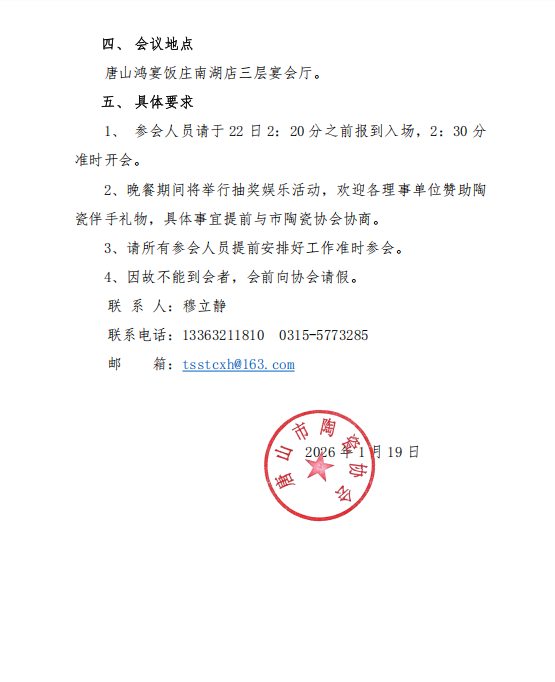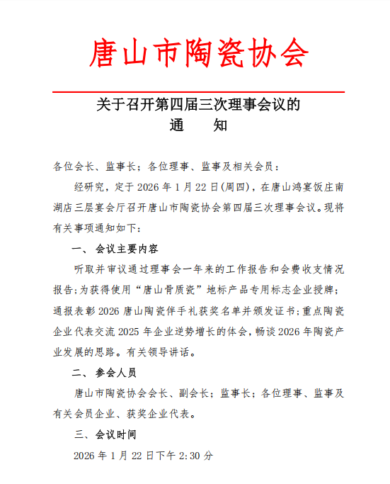 唐山市陶瓷协会关于召开第四届三次理事会议的通知