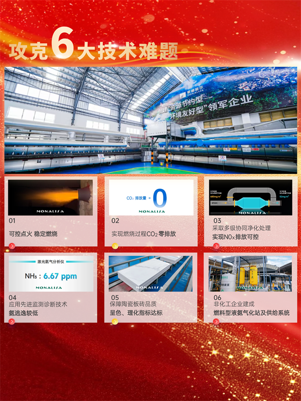 项目由蒙娜丽莎集团联合佛山仙湖实验室、蒙娜丽莎、德力泰、欧神诺、安清科技等五方,凝聚人才、技术、装备等持续攻克氨氢零碳燃烧技术在建筑陶瓷大工业化生产应用上的六大难题,验证了氨氢融合新能源技术推广应用到大生产、连续性工业窑炉的可行性,打通了技术从创新研发到工业实践的完整路径。