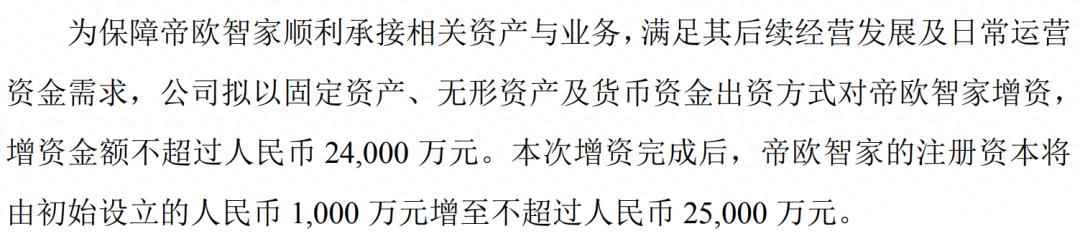 为保障帝欧智家顺利承接相关资产与业务,满足其后续经营发展及日常运营资金需求,帝欧水华拟以固定资产、无形资产及货币资金出资方式对帝欧智家增资,增资金额不超过人民币 24,000万元。本次增资完成后,帝欧智家的注册资本将由初始设立的人民币1,000万元增至不超过人民币25,000万元。