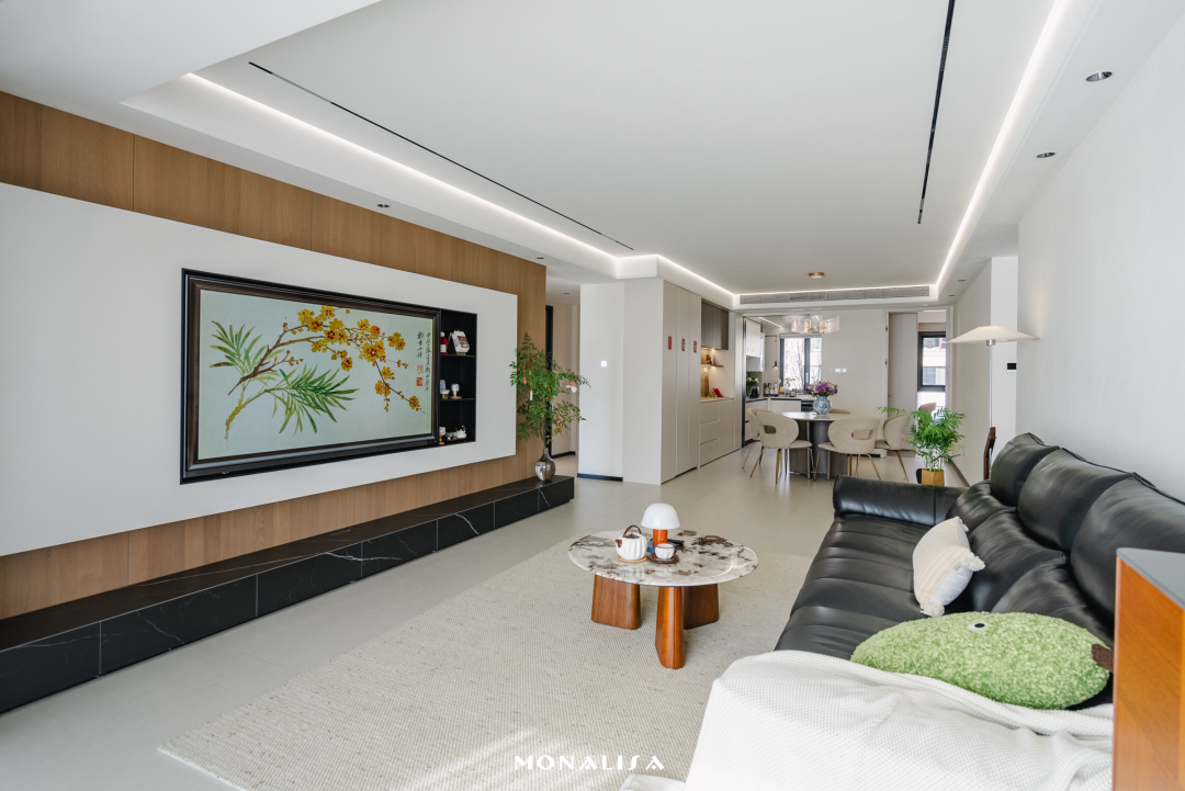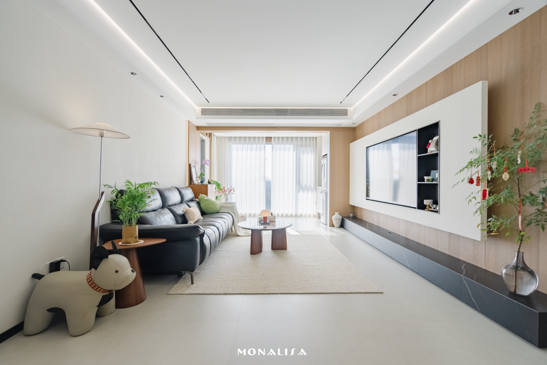 在地面通铺蒙娜丽莎750×1500㎜浅灰维托沙大砖,为家塑造低饱和的底色与柔和质感,再以胡桃木色柜体和黑色沙发搭配点睛,氛围温暖,富有活力。