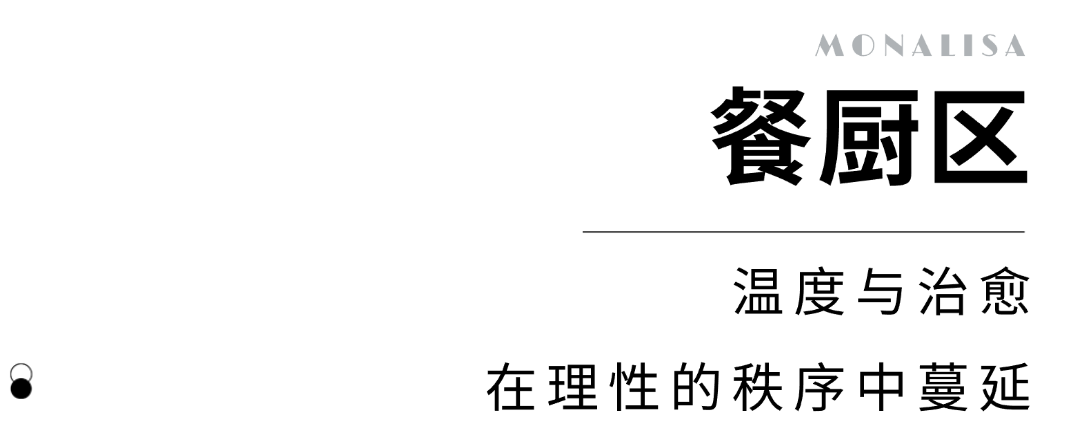 黑白柜体的色彩和线条利落,勾勒出简约通透的厨房动线,同时以暖调的地面和由芭比米灰大砖铺贴的墙面,中和黑白色与线型设计的冷感。