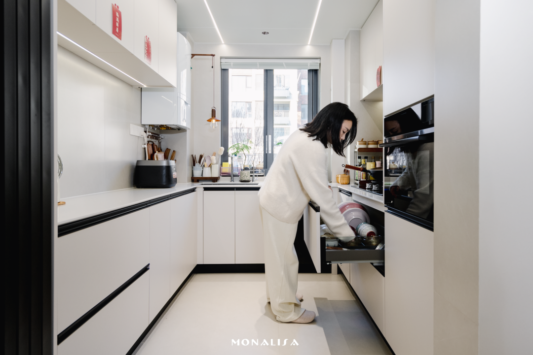 小薏习惯把生活安排得井井有条,厨房的装修亦然。精心设计“口袋门”,烹饪时轻推闭合,就能形成独立封闭的空间。
