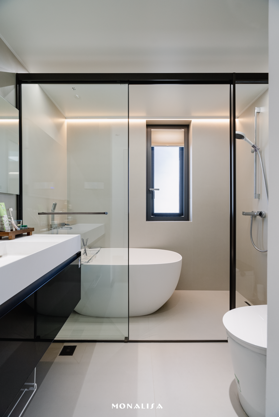 两个卫生间均铺贴同系列的维托沙大砖,但色彩选择与客厅有所区别的米黄、米灰,规格也灵活选择更适配卫浴空间的600×1200mm。