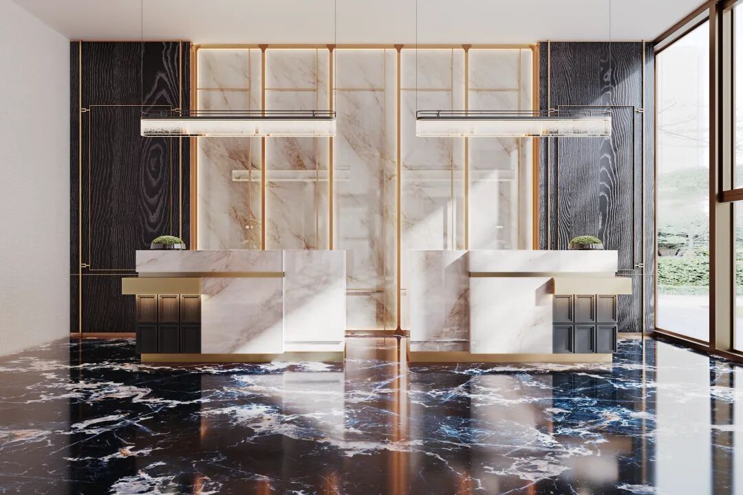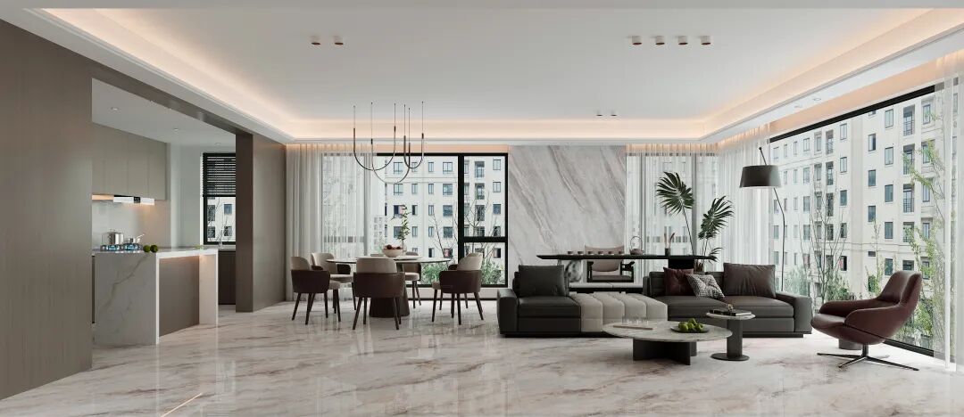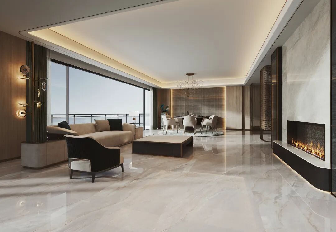 值得一提的是,其95°镜面平抛技术处理后的砖面,光感柔和而不刺眼,呈现出类似高级玉石的润泽光晕;触感温润细腻,实现了珍稀石材的纹理张力与玉石内敛质感的完美统一。