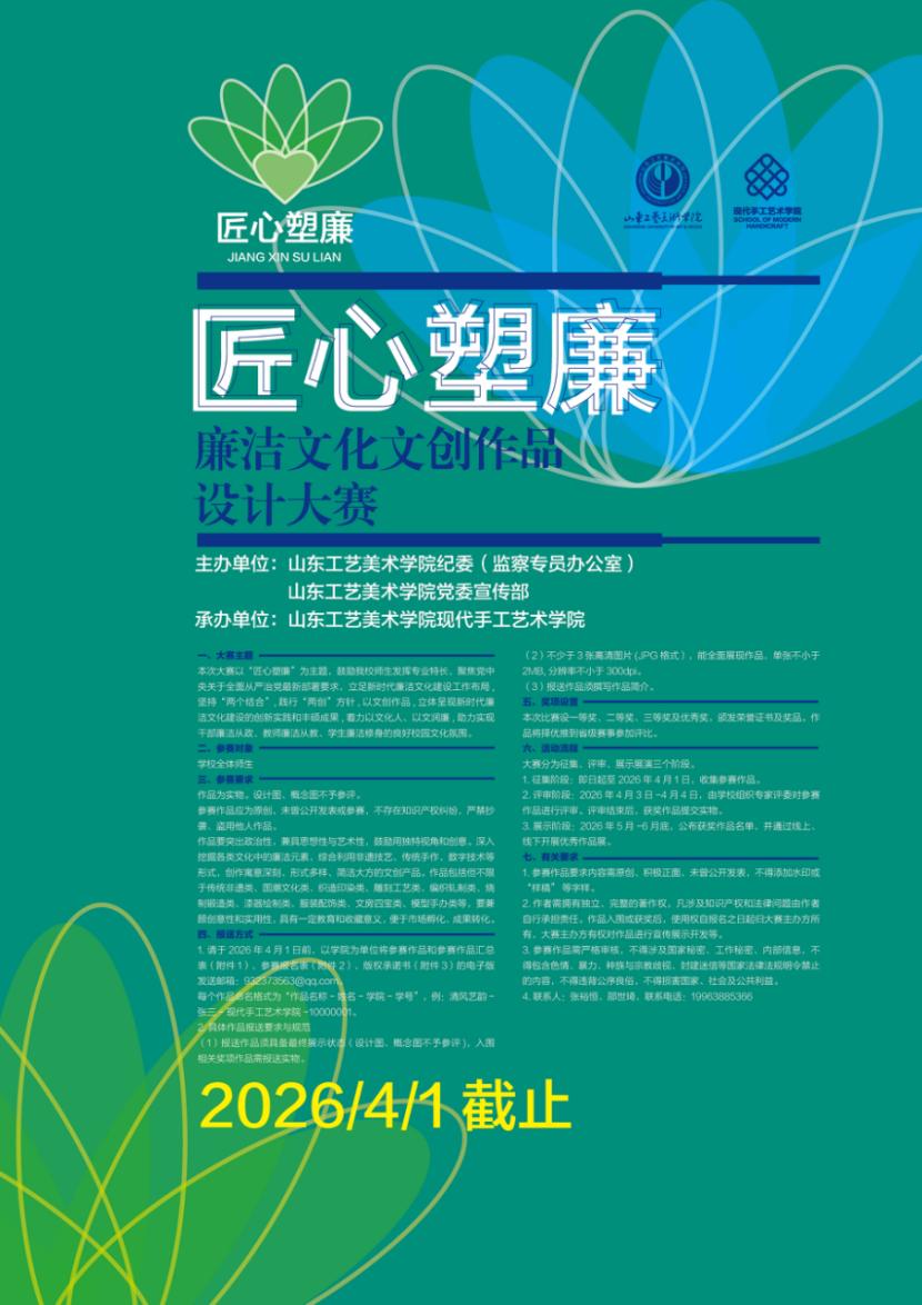 为深入贯彻习近平总书记关于党的自我革命的重要思想,全面落实党中央关于加强新时代廉洁文化建设的部署要求,以高质量的优秀作品,涵育清廉之源厚植廉洁之壤,大力营造崇德尚廉的良好社会风尚,特举办山东工艺美术学院“匠心塑廉” 廉洁文化文创作品设计大赛。现将有关事项通知如下。