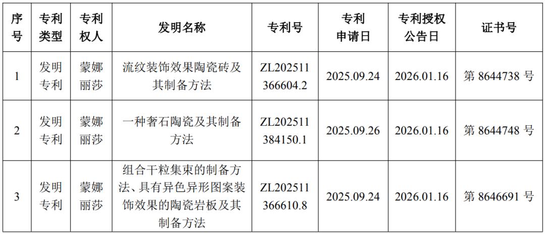 蒙娜丽莎则公告取得三项发明专利,涉及流纹装饰陶瓷砖、奢石陶瓷及组合干粒集束制备等技术。公司表示,这些自主研发成果虽不会对当前经营产生重大影响,但有助于增强技术创新与产品竞争力,对未来发展具有积极意义。