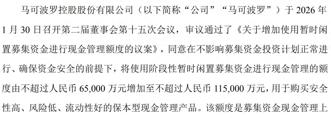 1月30日至31日,马可波罗与蒙娜丽莎两家陶瓷行业上市公司发布公告。马可波罗宣布,将使用暂时闲置募集资金进行现金管理的额度从不超过6.5亿元提高至不超过11.5亿元,用于购买安全性高、流动性好的保本型产品,如定期存款、结构性存款等,期限不超过12个月。公司可根据项目需要随时赎回。截至1月20日,其募集资金专项账户中尚有未使用资金。