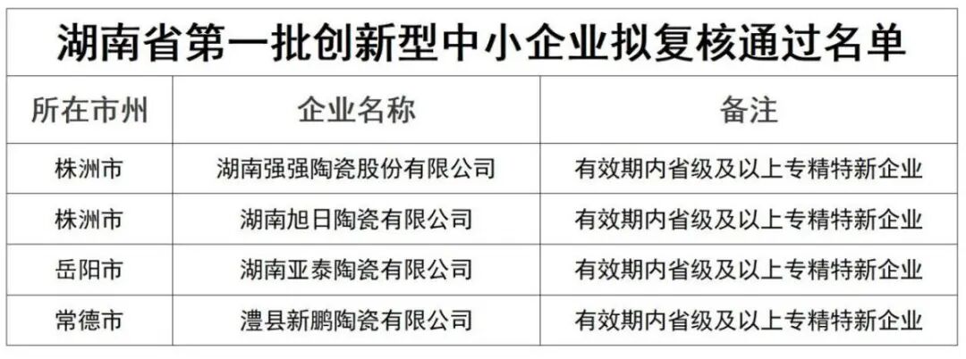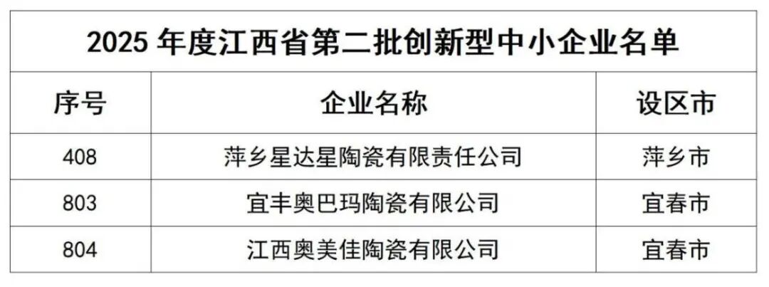 江西公布了2025年度第二批创新型中小企业名单,星达星、奥巴玛、奥美佳三家陶企入选。湖南公示了第一批创新型中小企业复核名单,强强、旭日、亚泰、新鹏四家陶企在列。