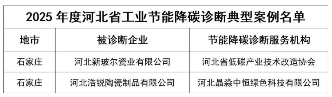 此外,河北发布了2025年度工业节能降碳诊断典型案例,新玻尔、浩锐两家陶瓷企业成功入选。