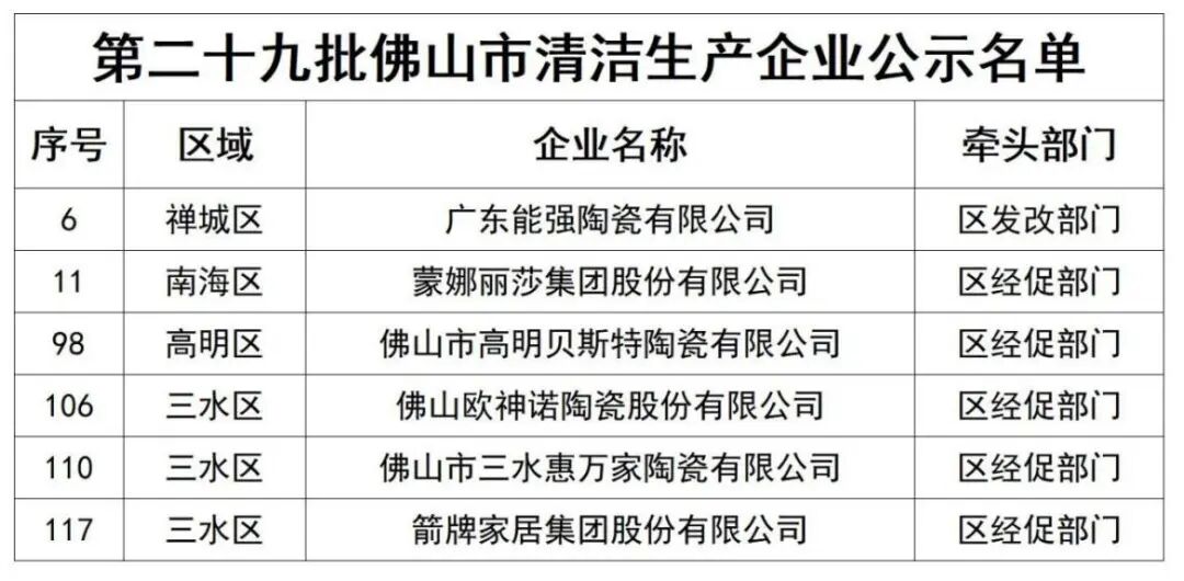 在佛山,市委、市政府召开表彰大会,陶瓷行业徐瑜、陈日富获评“劳动模范”,蓝胥元、赖日东、张脉官获评“先进劳动者”,新明珠集团当代陶瓷研究院等3家单位获评“先进集体”。同时,蒙娜丽莎、欧神诺、能强等企业入选佛山市第二十九批清洁生产企业名单。