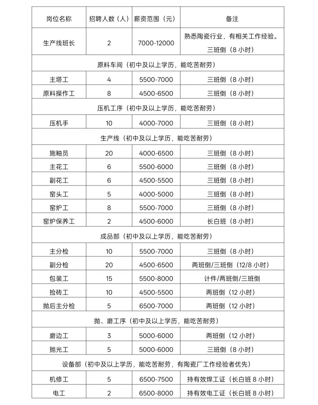 3.有陶瓷企业生产相关经验者优先。