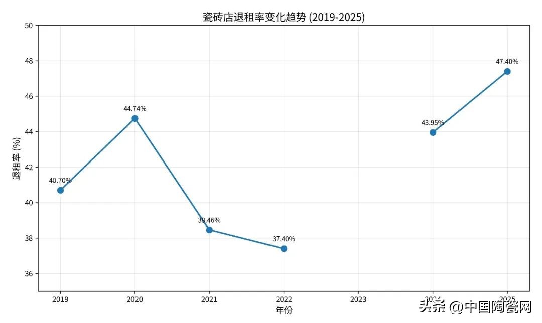 在这场残酷的行业洗牌中,依托卖场流量生存的各类商户均面临困境,其中瓷砖品类受到的冲击尤为剧烈。调查显示,全国家居卖场中瓷砖门店的退租率自2019年起便持续居于高位,且呈上升趋势。2025年,这一数据恶化至47.40%,意味着参与调研的卖场中,近一半的瓷砖门店已经撤离。