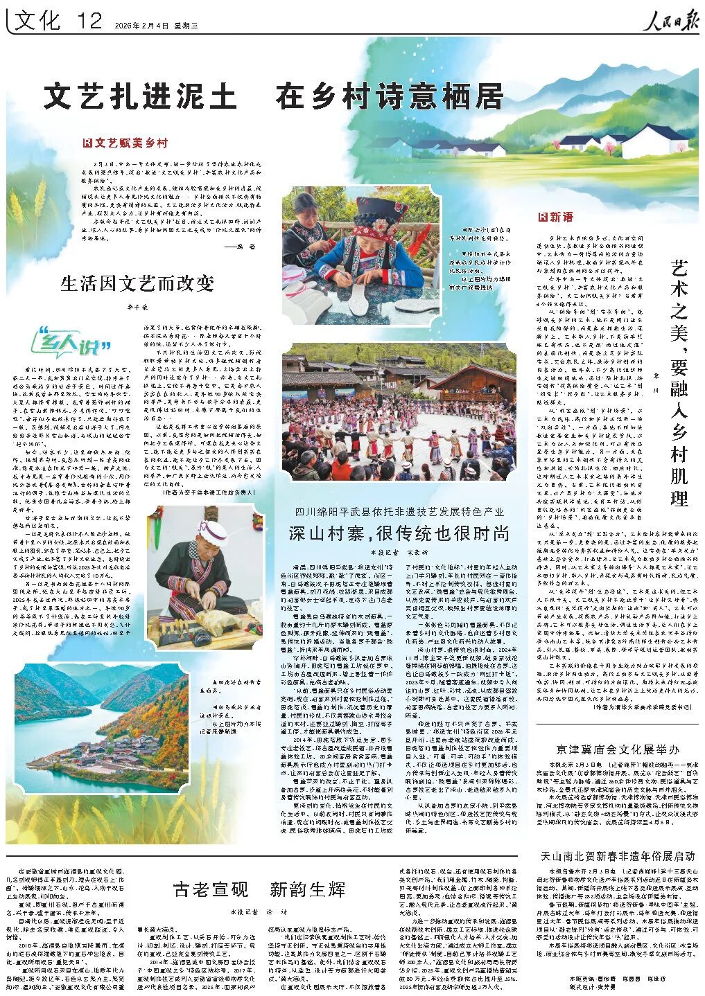 从“供给导向”到“需求导向”。能够赋美乡村的艺术,绝不是闭门造车或自我陶醉的,而是真正拥抱生活、深耕乡土。艺术融入乡村,不是简单照搬已有作品,也不是搞“雨过地皮湿”的表面化创作,而是要立足乡村实际需求,突出农民主体,激活乡村创新的内在活力。近年来,不少高校组织师生走进田间地头,通过“驻村扎根、按需创作”提高供给质量,从“送艺术”到“问需求”“携手做”,让艺术服务乡村、贴近群众。