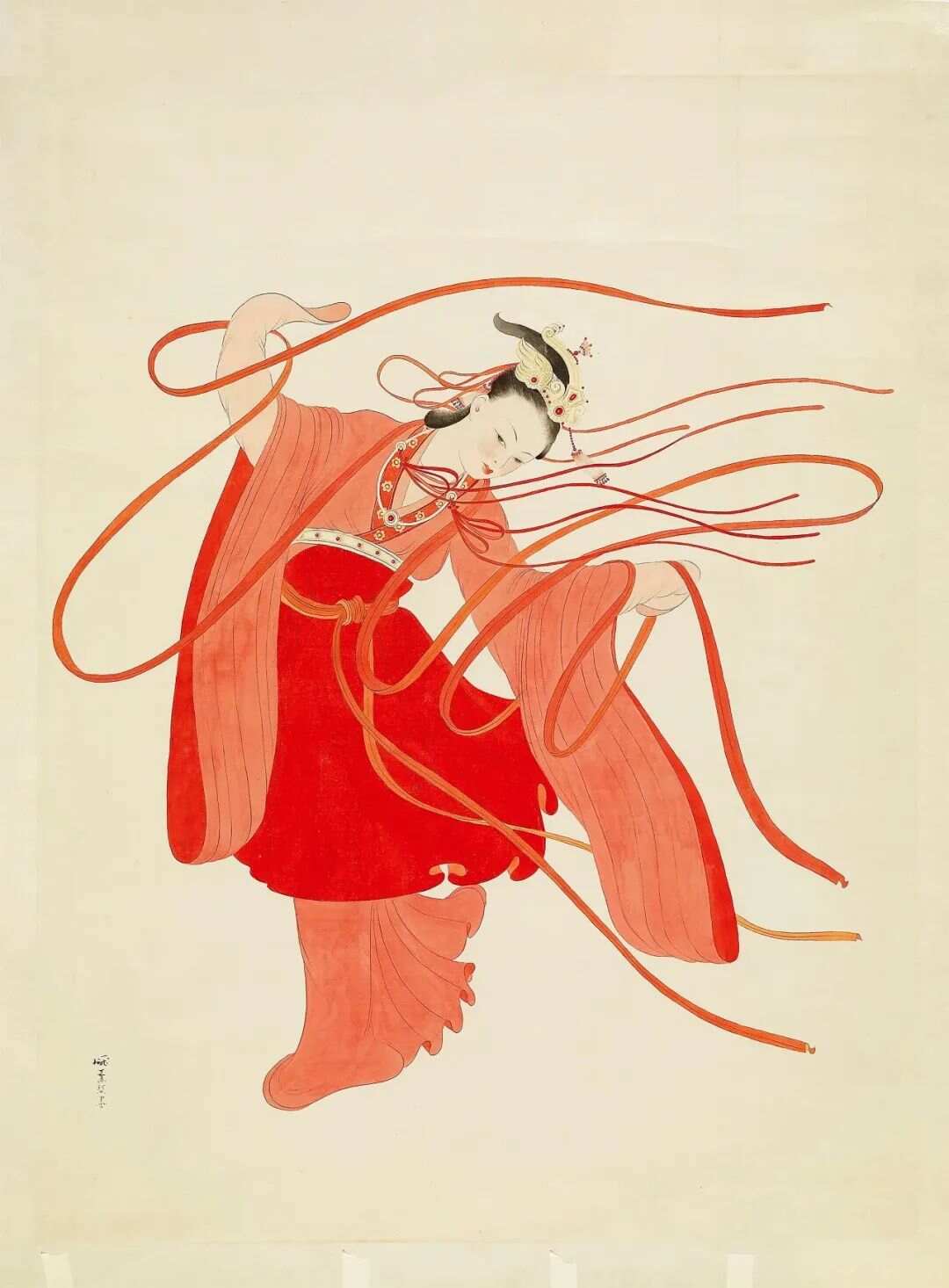 庞薰琹的《唐仕女带舞》以敦煌飞天为创作灵感,融合谢赫“气韵生动”的东方美学观念与柏格森“绵延流动”的生命哲学,通过贯连而富于节奏感的线条与色彩,构建出充满内在生命力的视觉秩序。