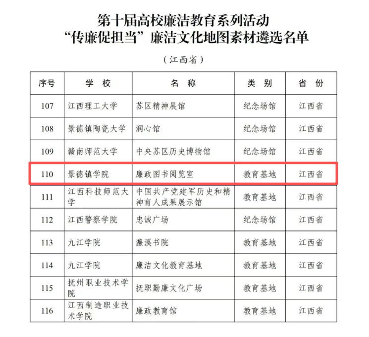 (本网讯:景苑轩)2月26日,教育部发布《关于第十届高校廉洁教育系列活动结果的公示》,我校“廉政图书阅览室”入选“传廉促担当”廉洁文化地图素材遴选名单。