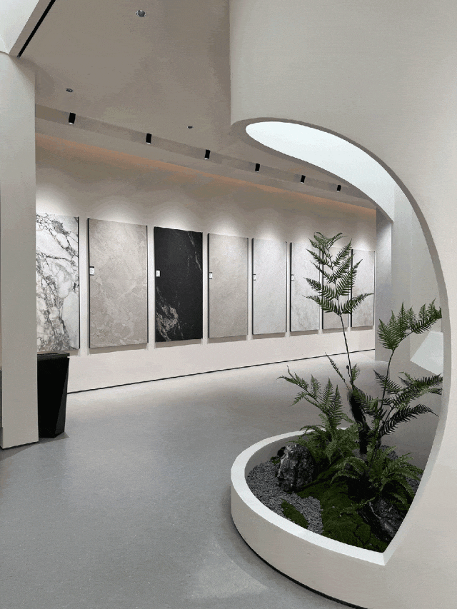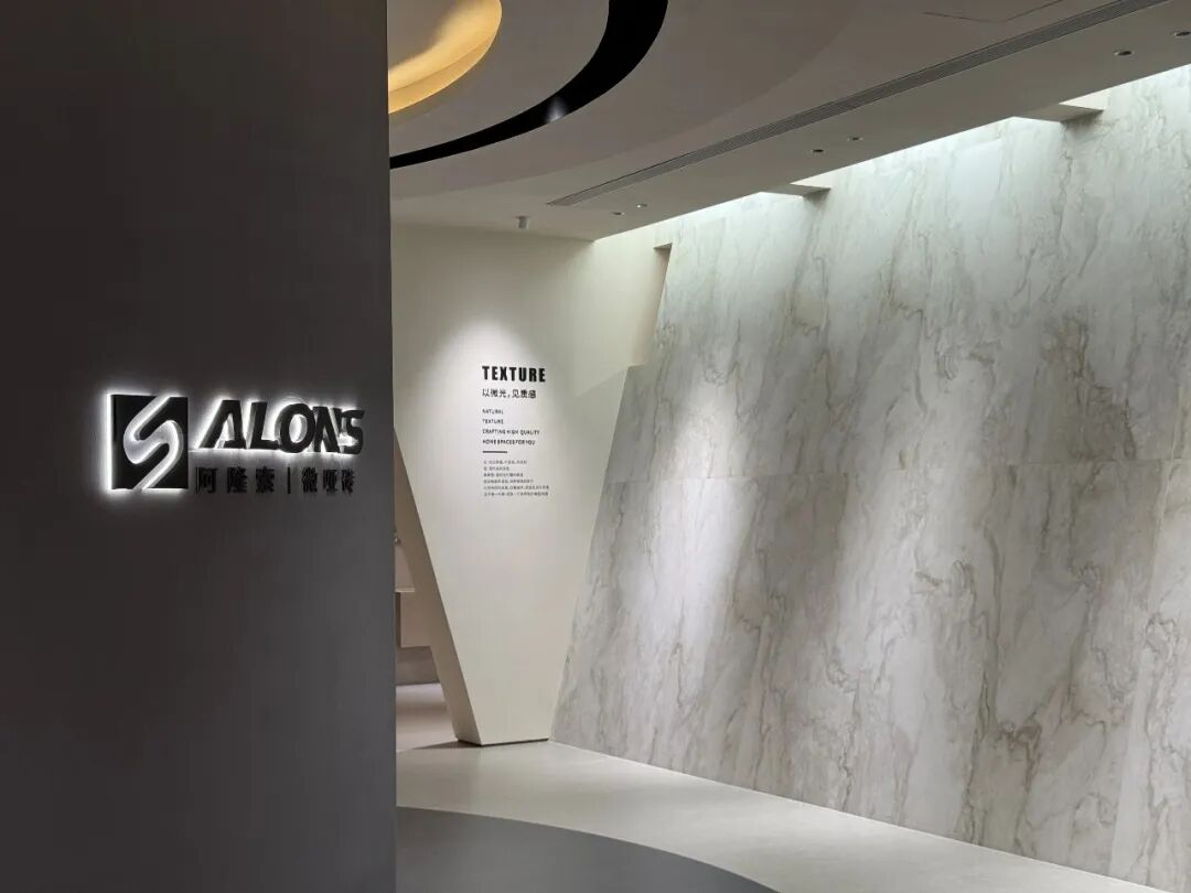 阿隆索(ALONS)微哑砖新展厅以“筑光为诗,栖心为境”为设计主题,通过极简美学与全场景体验的融合,重新定义了瓷砖展厅的叙事逻辑。展厅整体采用灰白为主色调,局部以深色石材与金属线条形成对比,既凸显微哑砖的质感层次,又营造出“艺术画廊般的沉浸感”。
