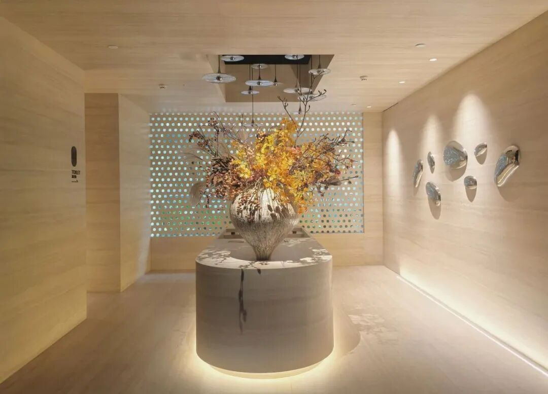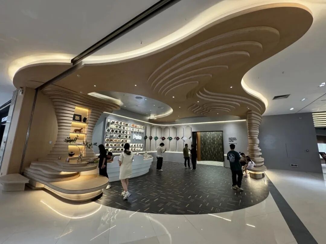 其空间以“自然韵律的轻量化表达”为核心。顶部曲线造型如蛋壳舒展般灵动,摒弃繁复装饰,仅用木质肌理与低饱和度莫兰迪光效,便营造出兼具精致感与松弛感的氛围,既贴合“无需喧哗,自有光华”的设计主张,又精准契合年轻人对“高端不沉重”的空间需求,让“建筑的皮肤”在此处有了具象表达。