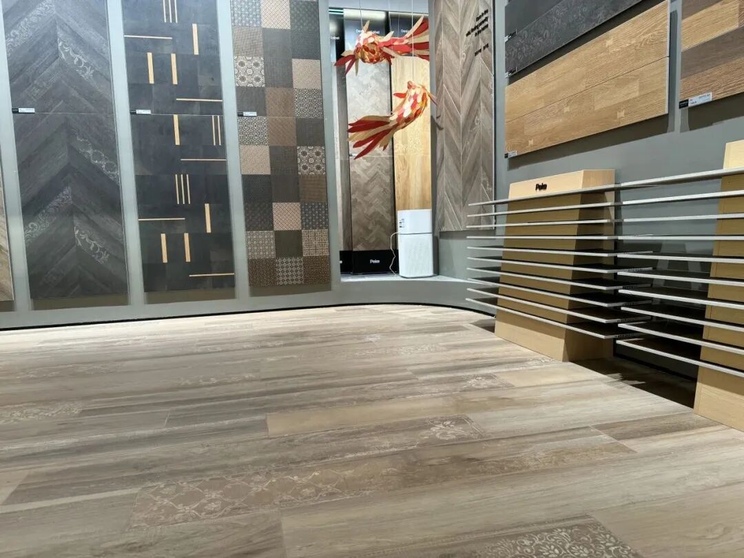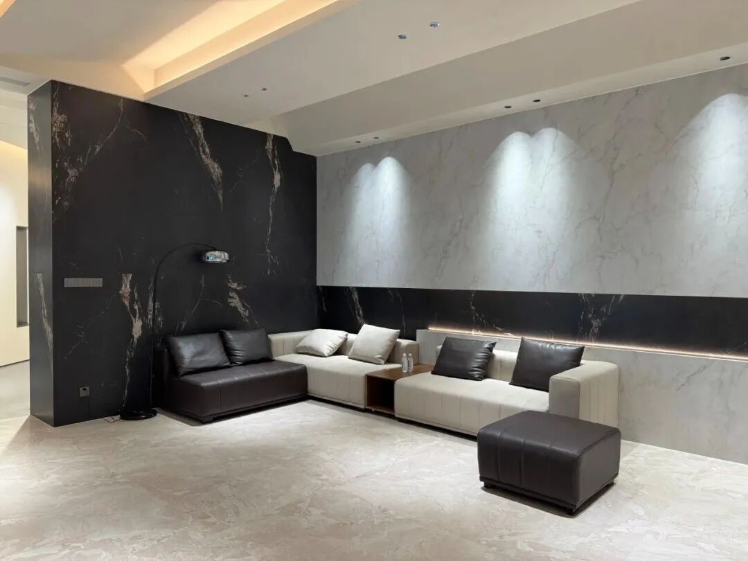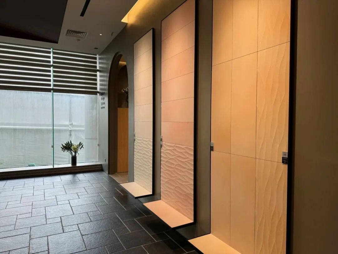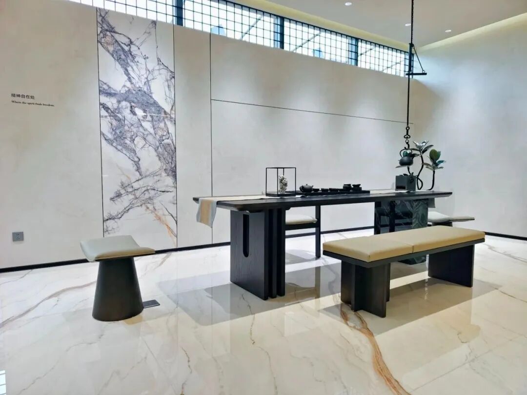 新展厅面积达1000㎡,迎合现代简奢风格,与意特陶注重科技、高端与年轻化的品牌调性一脉相承,上百款瓷砖新品整齐陈列,每一个展区不仅清晰地呈现瓷砖的花色质感与工艺特色,还通过1:1还原搭建了真实家居空间场景,让客户沉浸式体验产品所营造的温馨氛围与生活美学。
