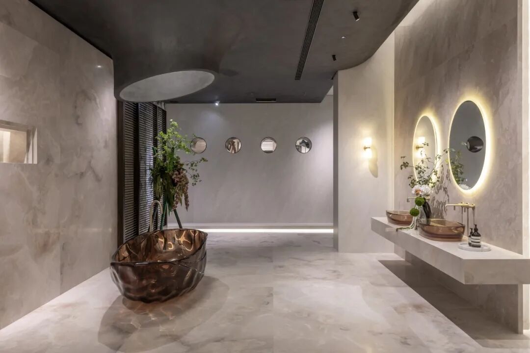 展厅通过微哑质感与光影诗性的结合,诠释了阿隆索“远离喧嚣,专注本心”的品牌哲学。微哑砖的低反光特性,让空间光线更柔和,从卫浴到客厅的全场景模拟,传递“家是‘哑’下来的地方”的生活主张。