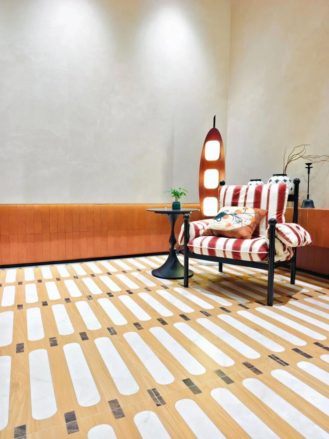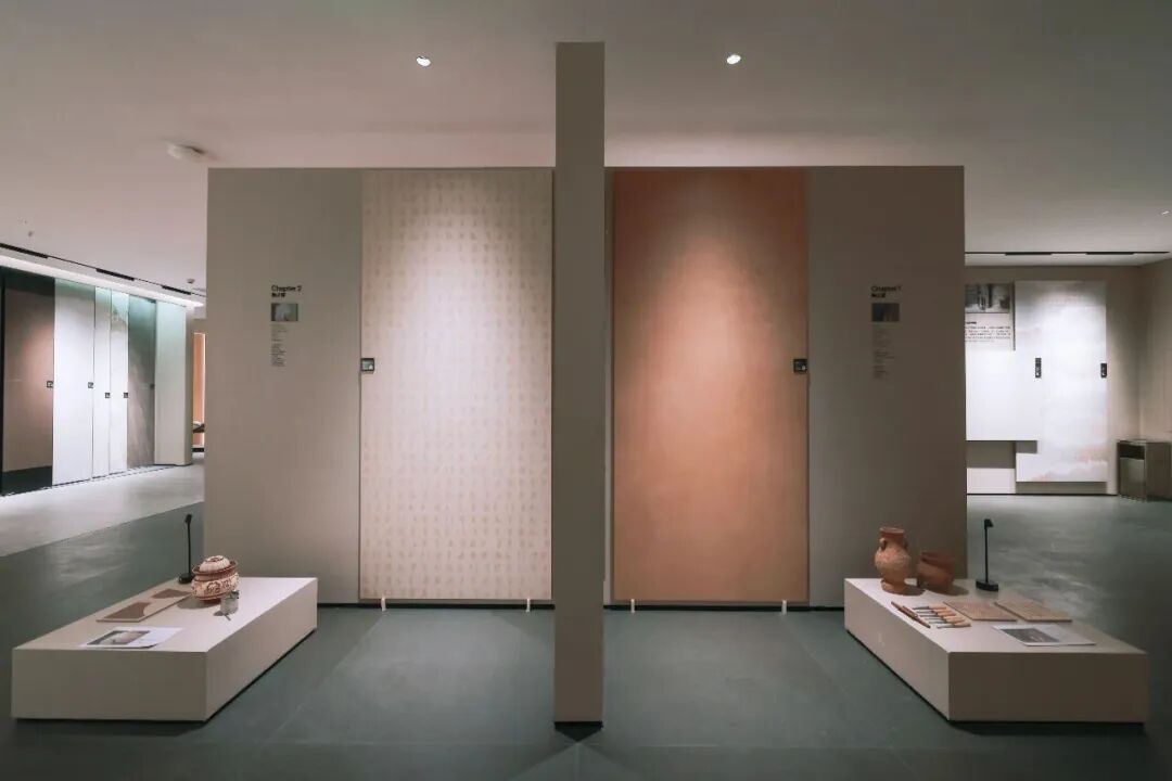 入口处的半掩门颇有有中国园林造景的情绪意境,随后便是艺术馆场景陈列,墙上五幅新品“艺术画”以及展柜中的几何拼接样品,无不展现出欧文莱瓷砖精微的细节塑造能力,更体现了新一代产品的工艺细腻度。