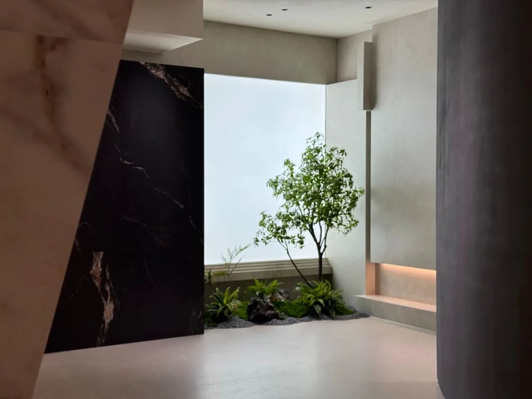 随后,视线被引向由岩板包裹、向上延展的“生命之树”,与由废弃电梯井改造而成的叠级水景。空间被清晰划分为情绪层、过渡层与产品层,观众的感受从被自然包裹的沉浸,过渡到对岩板可塑性的震撼,最终落于对奥卓斯8U交付解决方案的信赖。