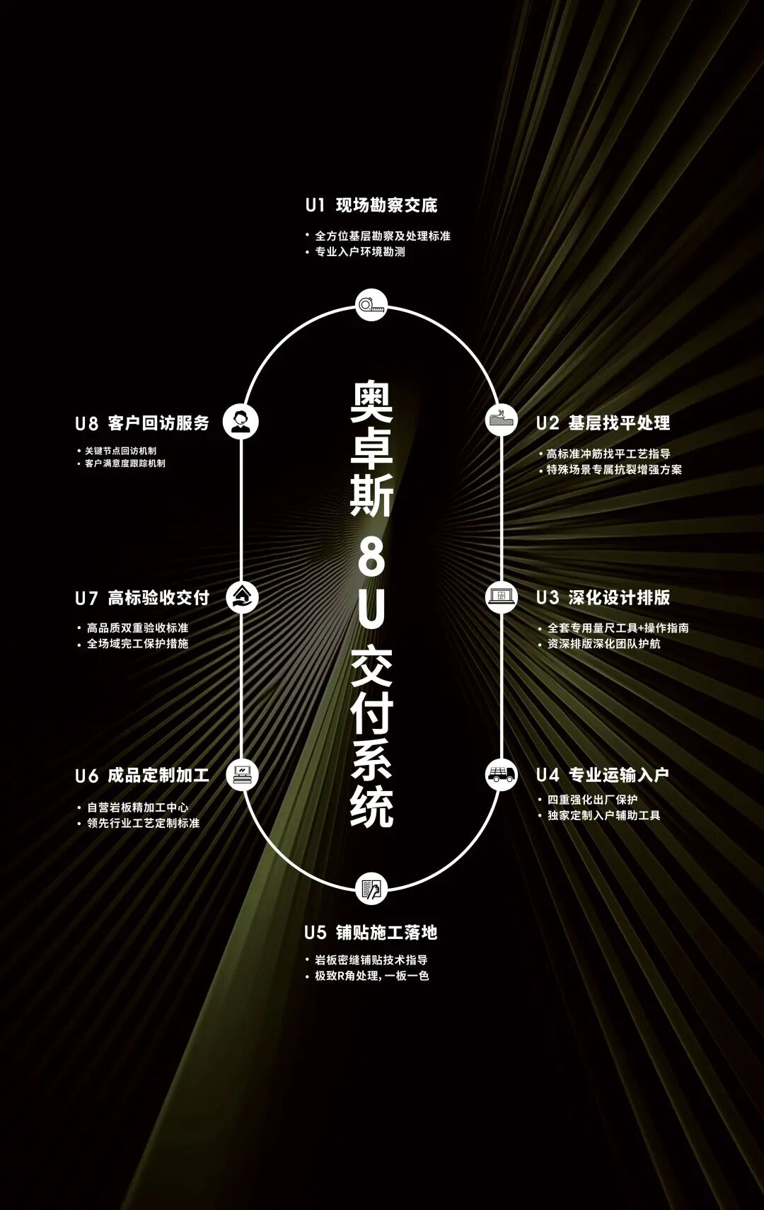 2025年7月,奥卓斯岩板正式推出并全面实施 “8U交付系统”。该系统以八大标准模块为核心,涵盖项目方案深化、加工协同、现场交付及售后维护等流程一体化交付体系。不仅通过数字化工具实现全程可视可控,更建立系统性服务培训机制,确保从技术到执行的每一个环节都达到高端标准,真正实现“设计即所得、所见即呈现”的品质落地,彻底解决了岩板行业长期存在的交付断层问题。