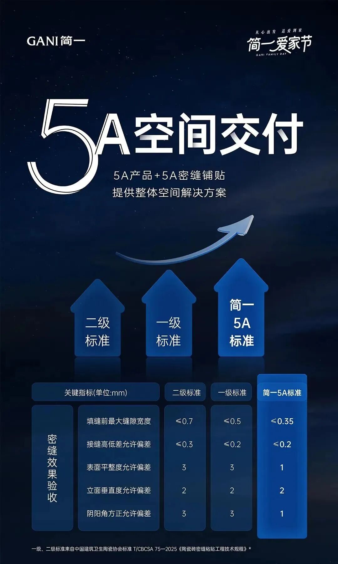 简一5A空间交付通过产品、工艺、服务的全链条标准化,致力于解决装修中的“开盲盒”问题,让装修效果可预期、质量有保障,为消费者打造高品质的居住空间。其中,简一联合中国建筑卫生陶瓷协会发布的《陶瓷砖密缝粘贴工程技术规程》为5A空间交付提供了密缝铺贴服务标准支撑。该标准明确了两个等级:一级标准要求缝隙小于0.5mm,二级标准为0.7mm。