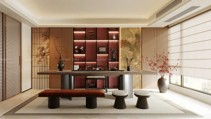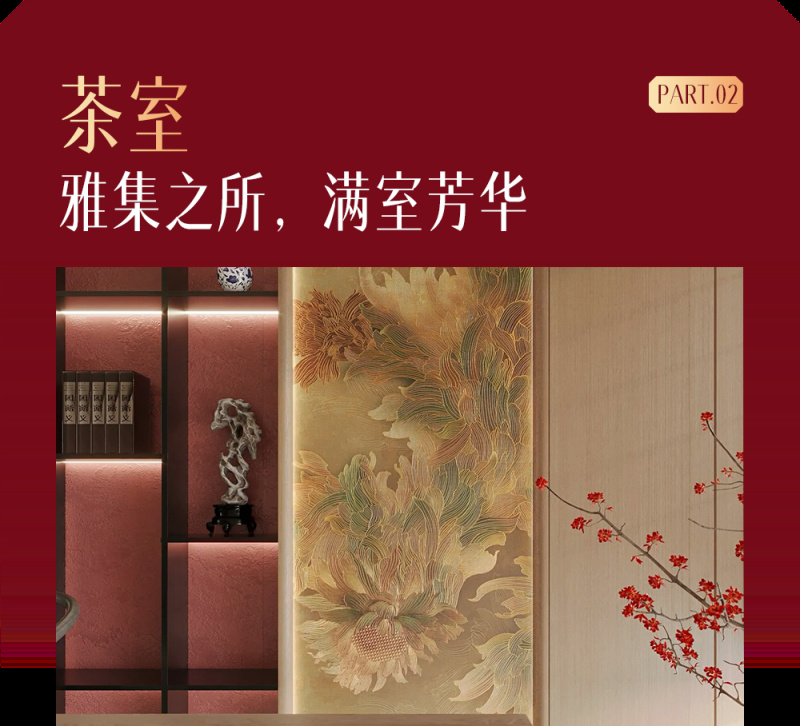 穿过客厅,步入茶室。这里是雅集之所,亦是新春品茗叙旧,沉淀心境的佳处。茶室墙面以「冠珠华脉岩板-京绣繁瑞」点缀,精工绣制花团锦簇的立体纹样,在光影中晕染出东方华贵,恰如诗意入境,为居所添福添贵。