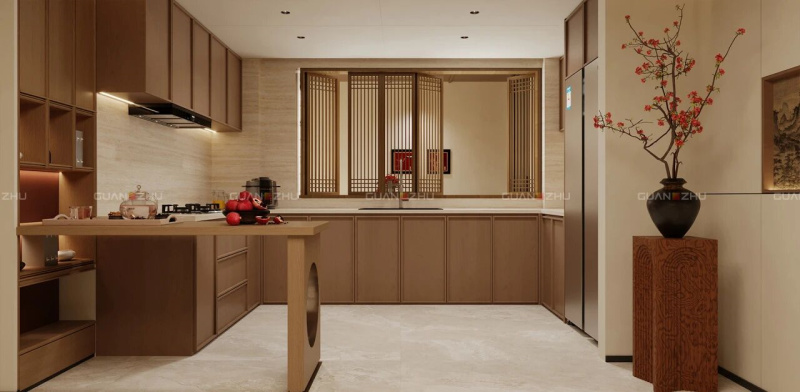 厨房墙面选用「冠珠岩板-白洞石」,以简约雅致的肌理延续宋式美学,耐脏易清洁的实用属性适配厨房实用需求,让空间历久弥新。
