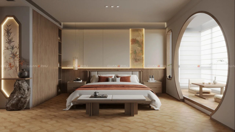 主卧地面铺贴「冠珠悦木系列-木羽-深咖」,木纹温润暖调,营造松弛安睡的私密感。墙面则以「冠珠华脉岩板-京绣繁瑞」点缀,吉祥纹样在暖光里晕染“岁岁平安”的美好与静谧。