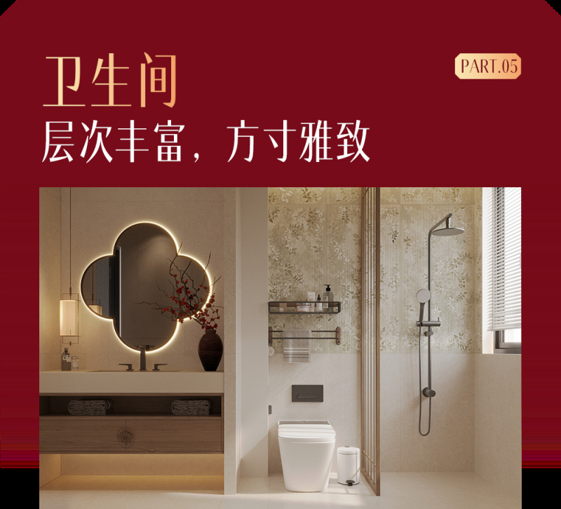卫生间以「冠珠风物纪系列」精心搭配,清雅素色为基调,花砖纹理立体灵动,丰富空间视觉层次的同时,于方寸之间清晰划分功能区,细节之处尽显雅致。