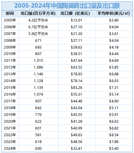 2024年是建陶出口的承压之年,全年建筑陶瓷总出口额锐减至45.96亿美元,同比大幅下降39.59%,其中陶瓷砖出口额32.41亿美元,同比下降33.26%,出口量6亿平方米,同比微降2.86%,出口均价更是跌至5.4美元/平方米,同比下降36.7%,“以价换量”的竞争模式弊端尽显。