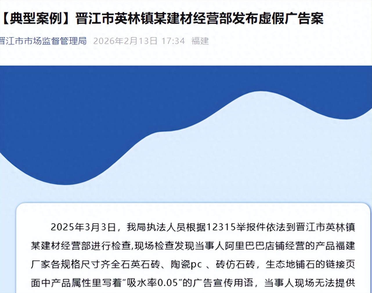 近日,福建晋江市市场监督管理局查处一起瓷砖虚假广告案件。某建材经营部在其网店页面宣传产品“吸水率0.05”,但无法提供证明,实际检测值为0.15%,构成虚假宣传。监管部门已责令其停止违法广告、消除影响并处以罚款。