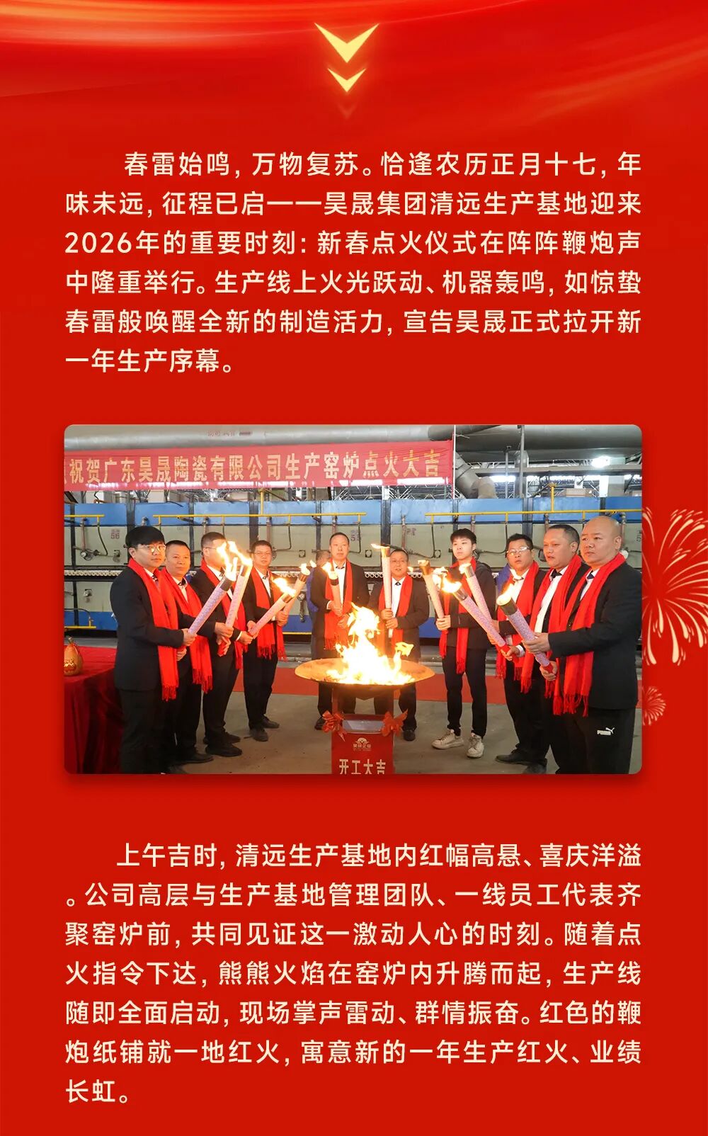 春雷始鸣,万物复苏。恰逢农历正月十七,年味未远,征程已启——吴晟集团清远生产基地迎来2026年的重要时刻:新春点火仪式在阵阵鞭炮声中隆重举行。生产线上火光跃动、机器轰鸣,如惊蛰春雷般唤醒全新的制造活力,宣告吴晟正式拉开新一年生产序幕。