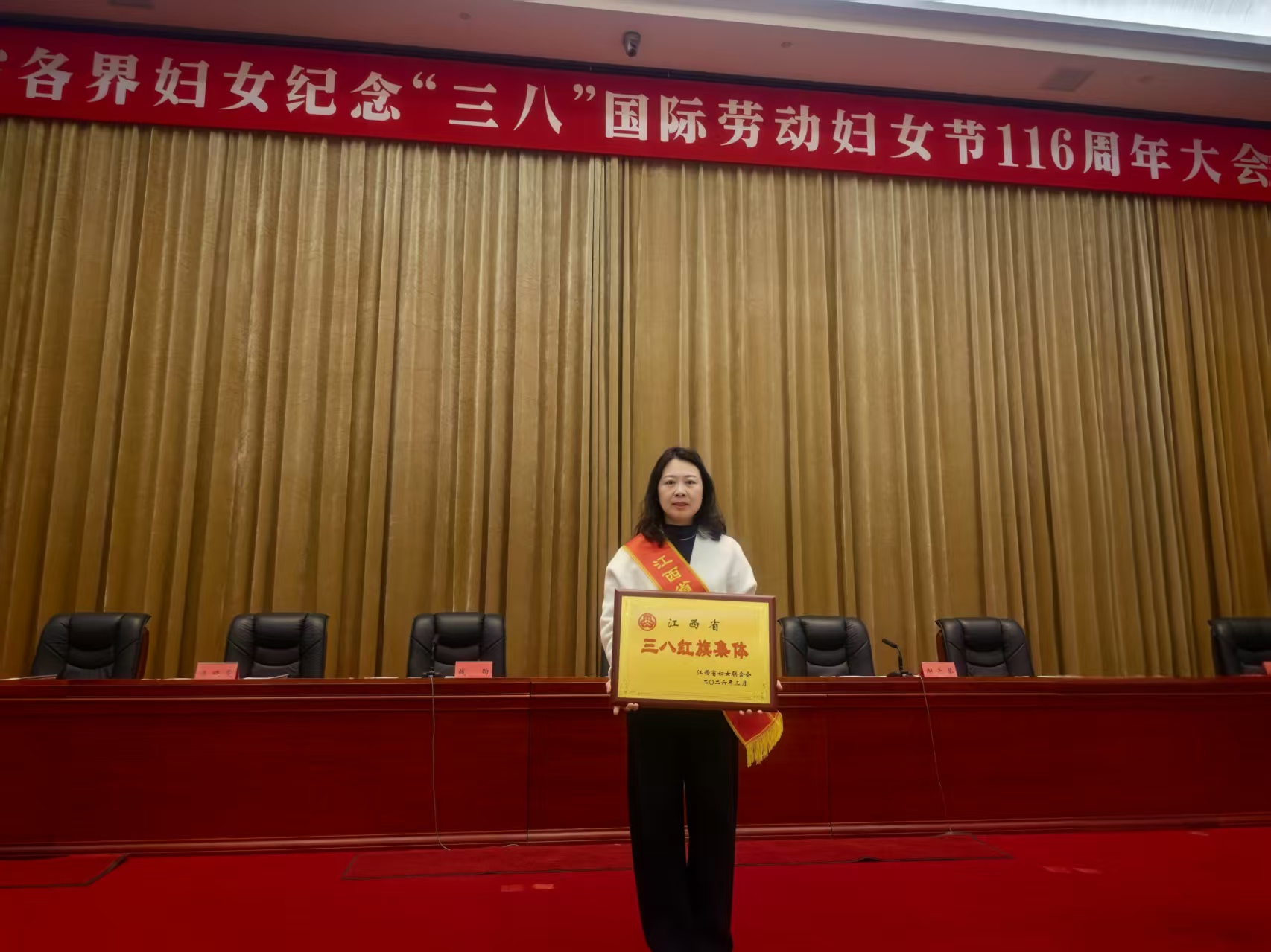 本网讯(党委组织部 熊果果)在“三八”国际劳动妇女节来临之际,景德镇陶瓷大学团委获评“江西省三八红旗集体”荣誉称号。3月7日,江西省各界妇女纪念“三八”国际劳动妇女节116周年大会在南昌举行,大会为受到表彰的代表颁奖,我校团委书记赵浩政代表集体参会并接受表彰。