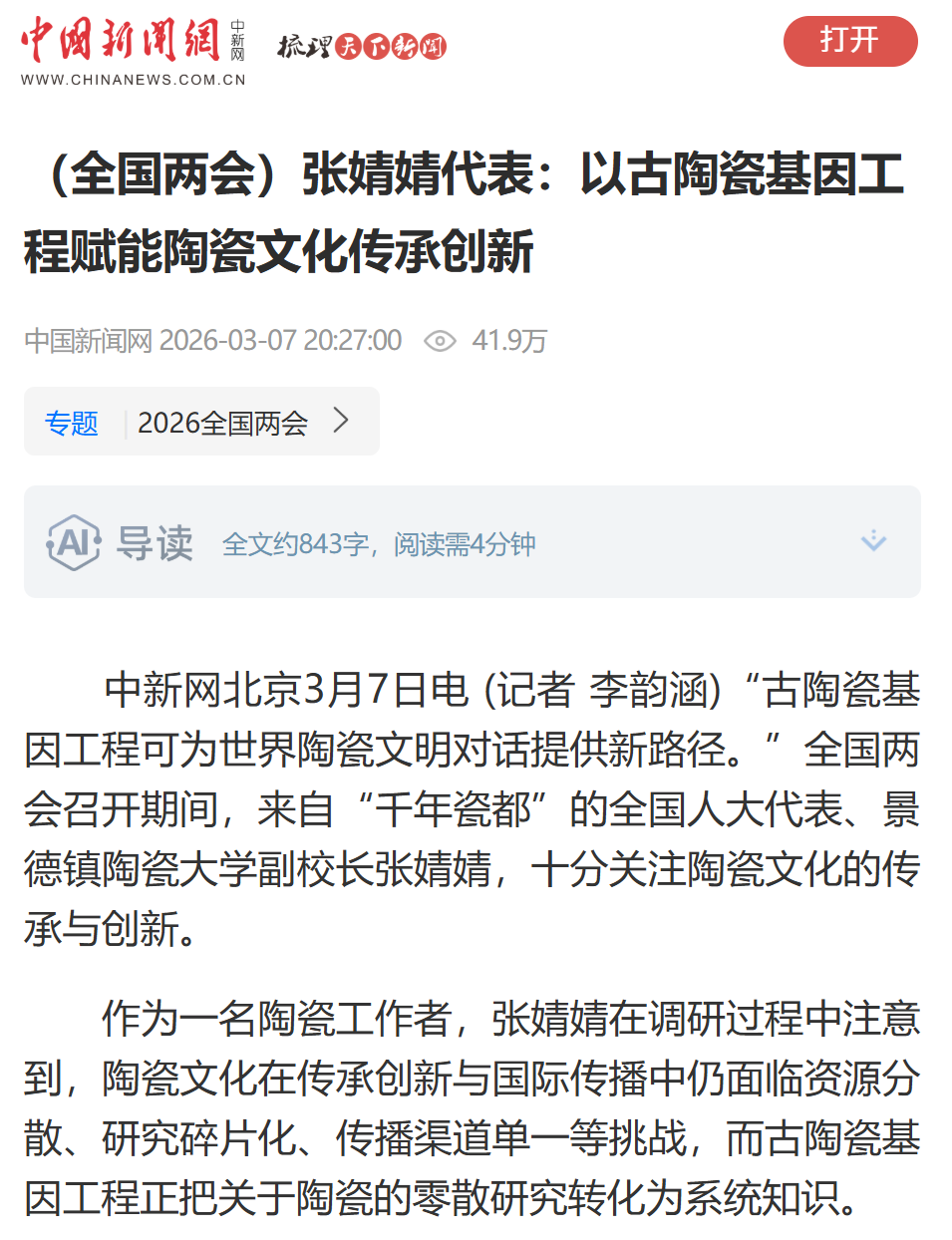 “陶瓷文化的生命力不仅在于学术研究,更在于融入当代生活,激发公众兴趣。”全国人大代表、景德镇陶瓷大学副校长张婧婧说。