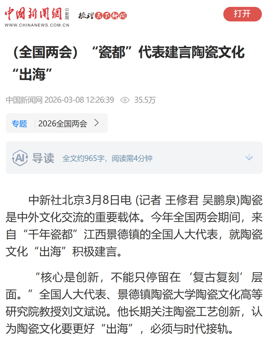 陶瓷是中外文化交流的重要载体。今年全国两会期间,来自“千年瓷都”江西景德镇的全国人大代表,就陶瓷文化“出海”积极建言。