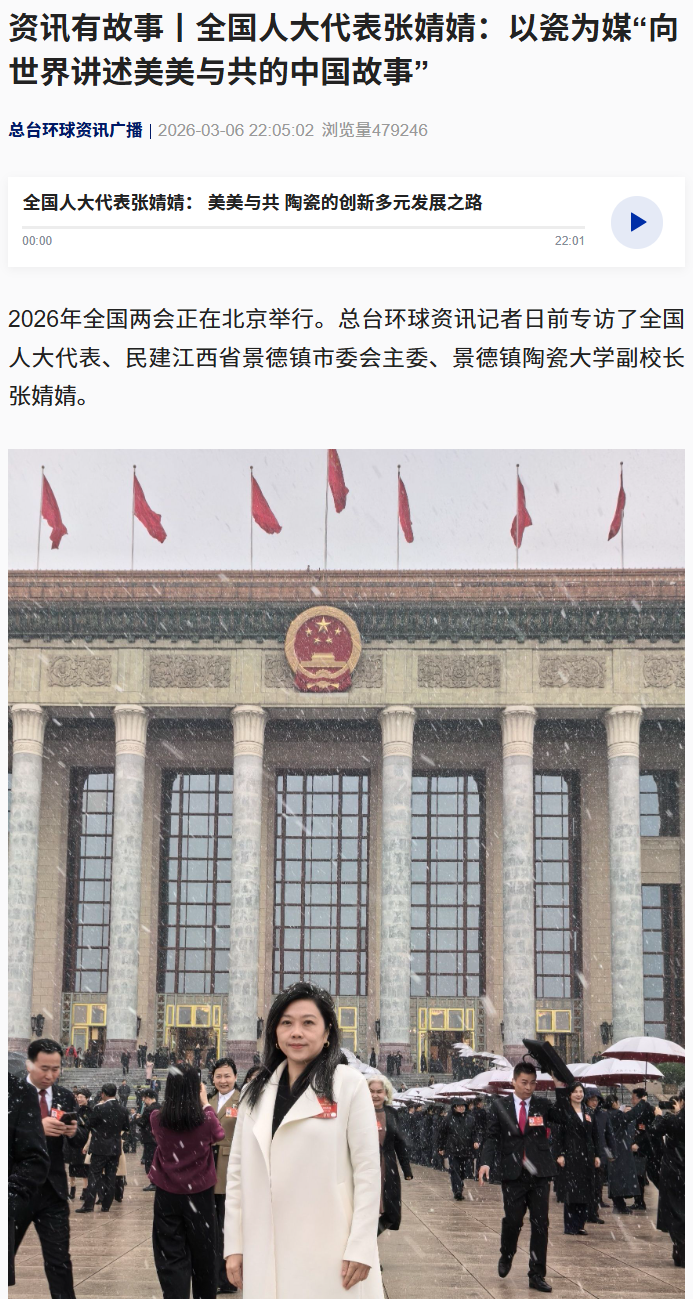 2026年全国两会正在北京举行。总台环球资讯记者日前专访了全国人大代表、民建江西省景德镇市委会主委、景德镇陶瓷大学副校长张婧婧。
