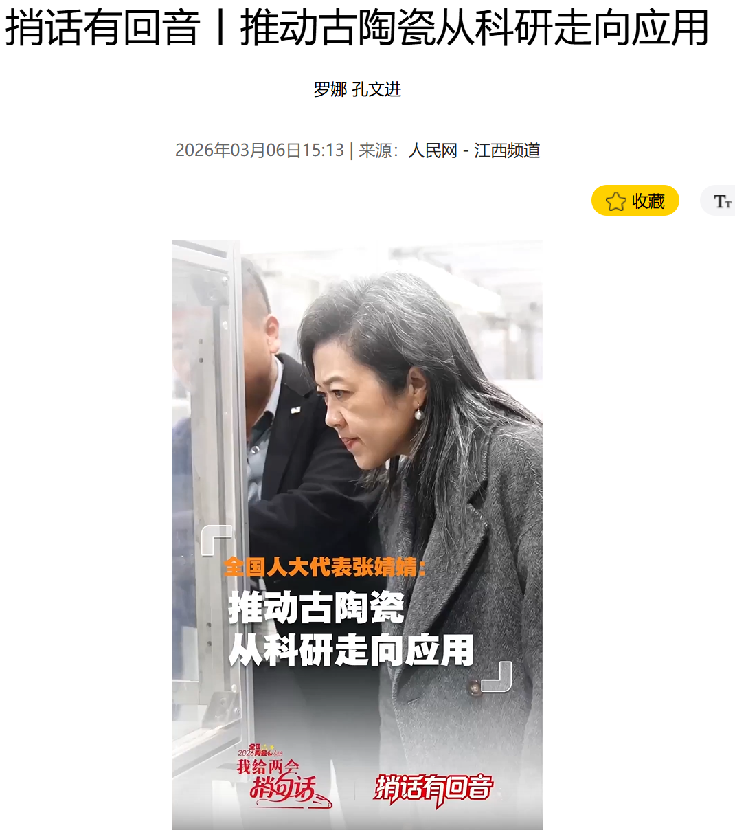 全国人大代表、景德镇陶瓷大学副校长张婧婧围绕建设中国—土耳其陶瓷“一带一路”联合实验室、建设国家日用及建筑陶瓷工程技术研究中心、支持江西省打造国家级先进陶瓷产业集聚区等内容,全国人大代表、景德镇陶瓷大学陶瓷文化高等研究院教授刘文斌围绕陶瓷文化“出海”、加强国家级陶瓷非遗技艺数字化保护与活态传承等内容建言献策。