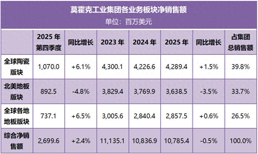 全球最大陶瓷企业莫和克工业集团公布2025年财报,全年合并净销售额达108亿美元,同比微降0.5%;调整后净利润为5.59亿美元,下降9.4%。其中陶瓷业务净销售额43亿美元,增长1.5%,占总销售额39.8%;息税前利润增长6.9%至2.667亿美元。集团全年业绩总体平稳,主要得益于第四季度的强劲表现,当季净销售额同比增长2.4%至27亿美元。